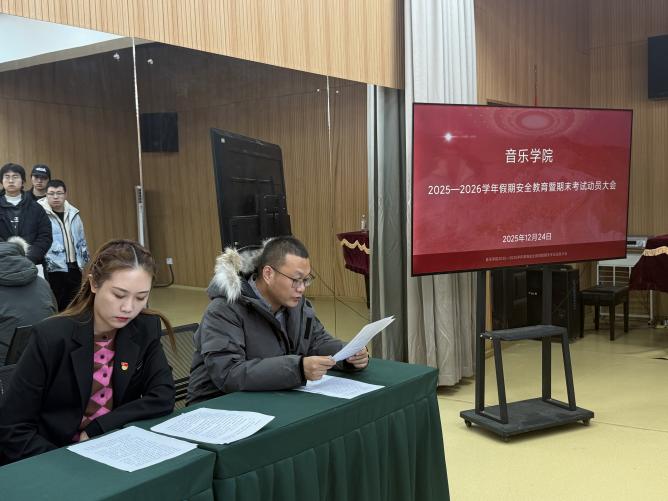 12月24日,音乐学院召开“假期安全教育暨期末考试动员大会”。学院党总支副书记、副院长张孝伟,副院长栗琳,学工办主任、团委书记郝苗及辅导员罗英恺、于海腾出席会议,与全体同学共话“诚信迎考、安全度假”。